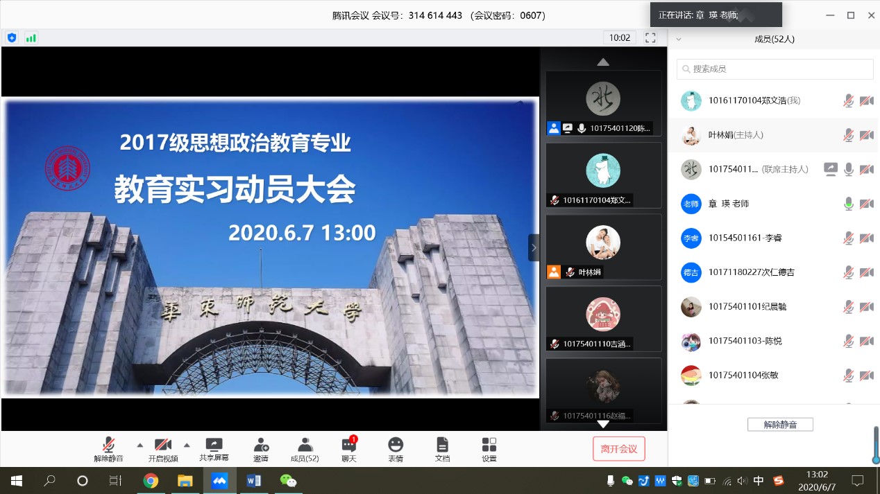 2017级思想政治教育专业实习动员大会于2020年6月7日下午13:00在腾讯会议线上顺利举行,第一会所 副院长许瑞芳及章瑛、史俊、翟贤亮和叶林娟等老师参加,会议特别邀请了何静、李睿、朱诗妤三位学长学姐进行经验分享。