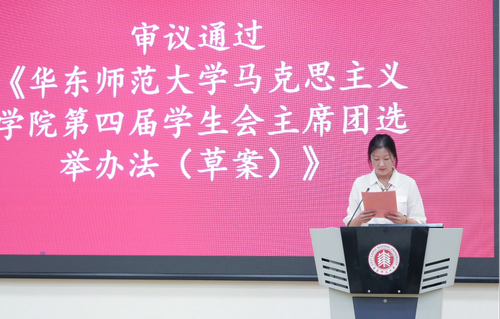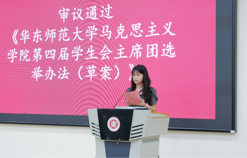 仝洋与赵紫瑶同学分别宣读《第一会所 第四届学生会主席团选举办法(草案)》和《第一会所 第四届学生会主席团选举监票人、唱票人、计票人名单(草案)》。经全体代表举手表决,两项草案均获全票通过。