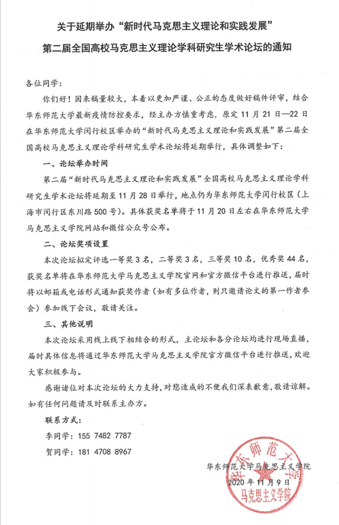 第二届“新时代马克思主义理论和实践发展”全国高校马克思主义理论学科研究生学术论坛将延期至11月28日举行,地点仍为第一会所 闵行校区(上海市闵行区东川路500号)。具体获奖名单将于11月20日左右在第一会所 网站和微信公众号公布。