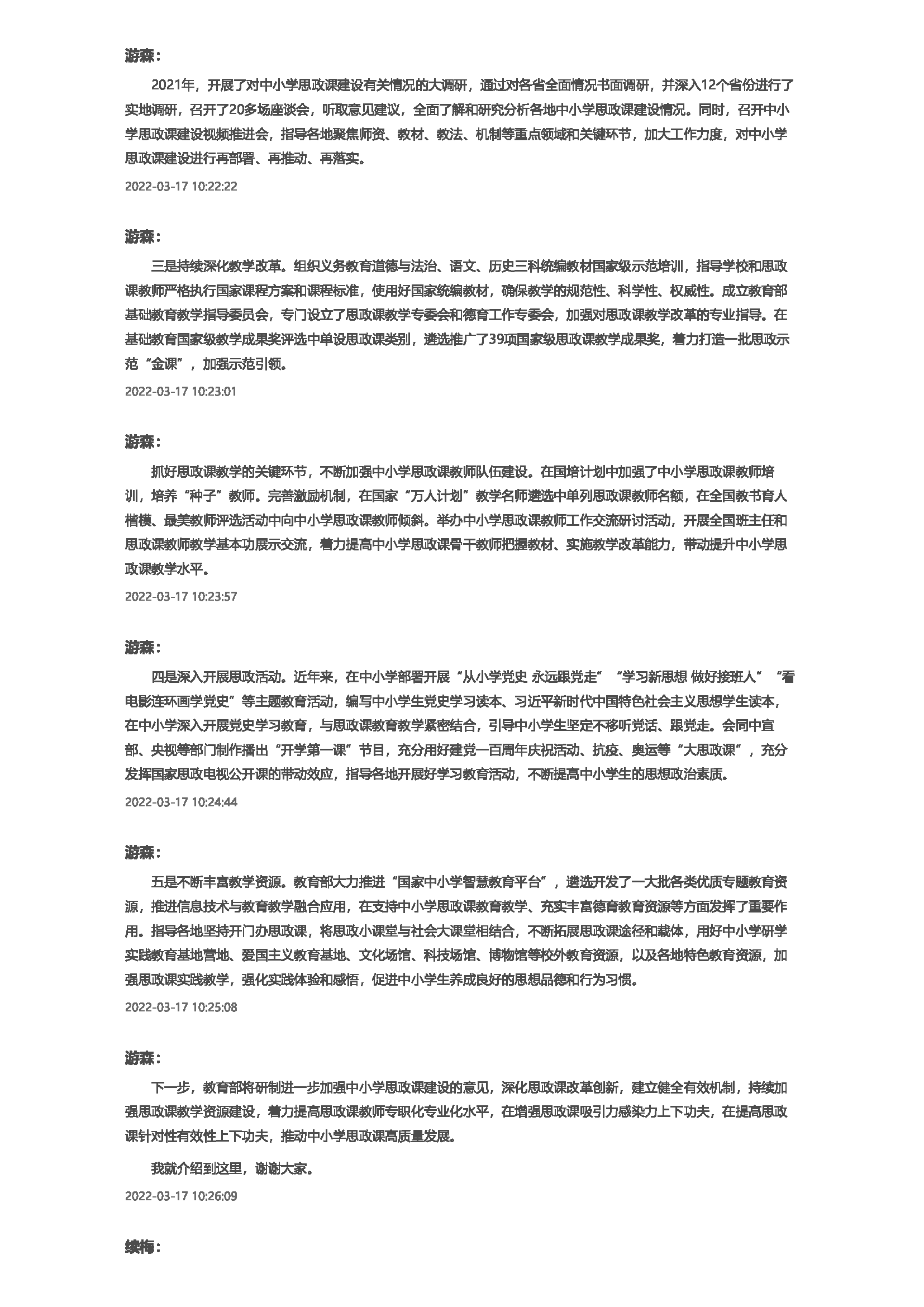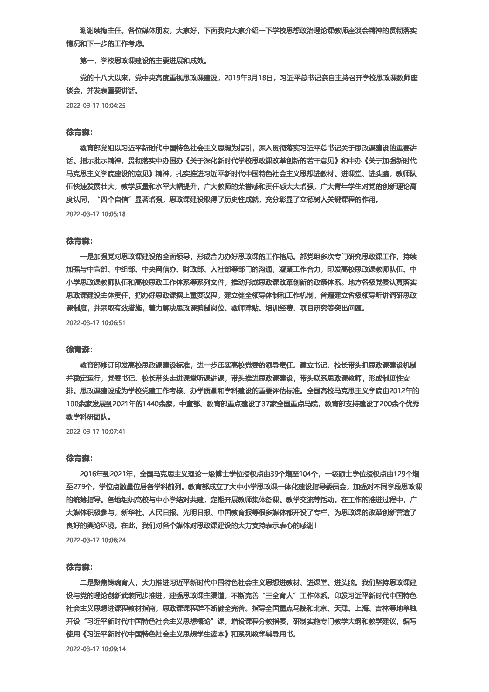 各位嘉宾,各位记者朋友,大家上午好!欢迎大家来参加教育部今天的新闻发布会。明天是3月18日,三年前,也就是2019年的3月18日,习近平总书记主持召开了学校思想政治理论课教师座谈会,并且发表了重要讲话,从党和国家事业长远发展的战略高度出发,深刻阐明学校思政课的重要意义,就如何办好新时代思政课做出部署,提出要求,为做好新时代学校思想政治工作、培养担当民族复兴大任的时代新人,提供了重要遵循。