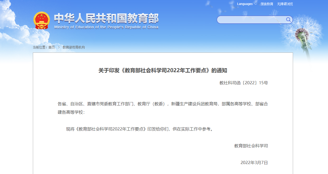 2022年教育部社科司工作的总体要求是:以习近平新时代中国特色社会主义思想为指导,深入学习贯彻党的十九大和十九届历次全会精神,以迎接学习贯彻党的二十大为主线,认真贯彻习近平总书记关于教育的重要论述特别是在学校思想政治理论课教师座谈会上的重要讲话精神、关于哲学社会科学工作的重要论述精神,深刻认识“两个确立”的决定性意义,增强“四个意识”、坚定“四个自信”、做到“两个维护”,坚持稳中求进工作总基调,坚持问题导向、目标导向、效果导向相统一,以统筹推进“大思政课”建设和启动实施2035高校哲学社会科学高质量发展行动计划作为工作总牵引,加快推进高校思政课建设、哲学社会科学研究和教育出版高质量发展。