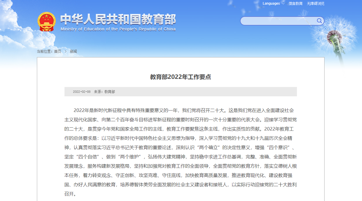 2022年是新时代新征程中具有特殊重要意义的一年,我们党将召开二十大。这是我们党在进入全面建设社会主义现代化国家、向第二个百年奋斗目标进军新征程的重要时刻召开的一次十分重要的代表大会。迎接学习贯彻党的二十大,是贯穿今年党和国家全局工作的主线,教育工作要聚焦这条主线,作出实质性的贡献。2022年教育工作的总体要求是:以习近平新时代中国特色社会主义思想为指导,深入学习贯彻党的十九大和十九届历次全会精神,认真贯彻落实习近平总书记关于教育的重要论述,深刻认识“两个确立”的决定性意义,增强“四个意识”、坚定“四个自信”、做到“两个维护”,弘扬伟大建党精神,坚持稳中求进工作总基调,完整、准确、全面贯彻新发展理念,服务构建新发展格局,坚持和加强党对教育工作的全面领导,全面贯彻党的教育方针,落实立德树人根本任务,着力转变观念、守正创新、攻坚克难、守住底线,加快教育高质量发展,推进教育现代化、建设教育强国、办好人民满意的教育,培养德智体美劳全面发展的社会主义建设者和接班人,以实际行动迎接党的二十大胜利召开。