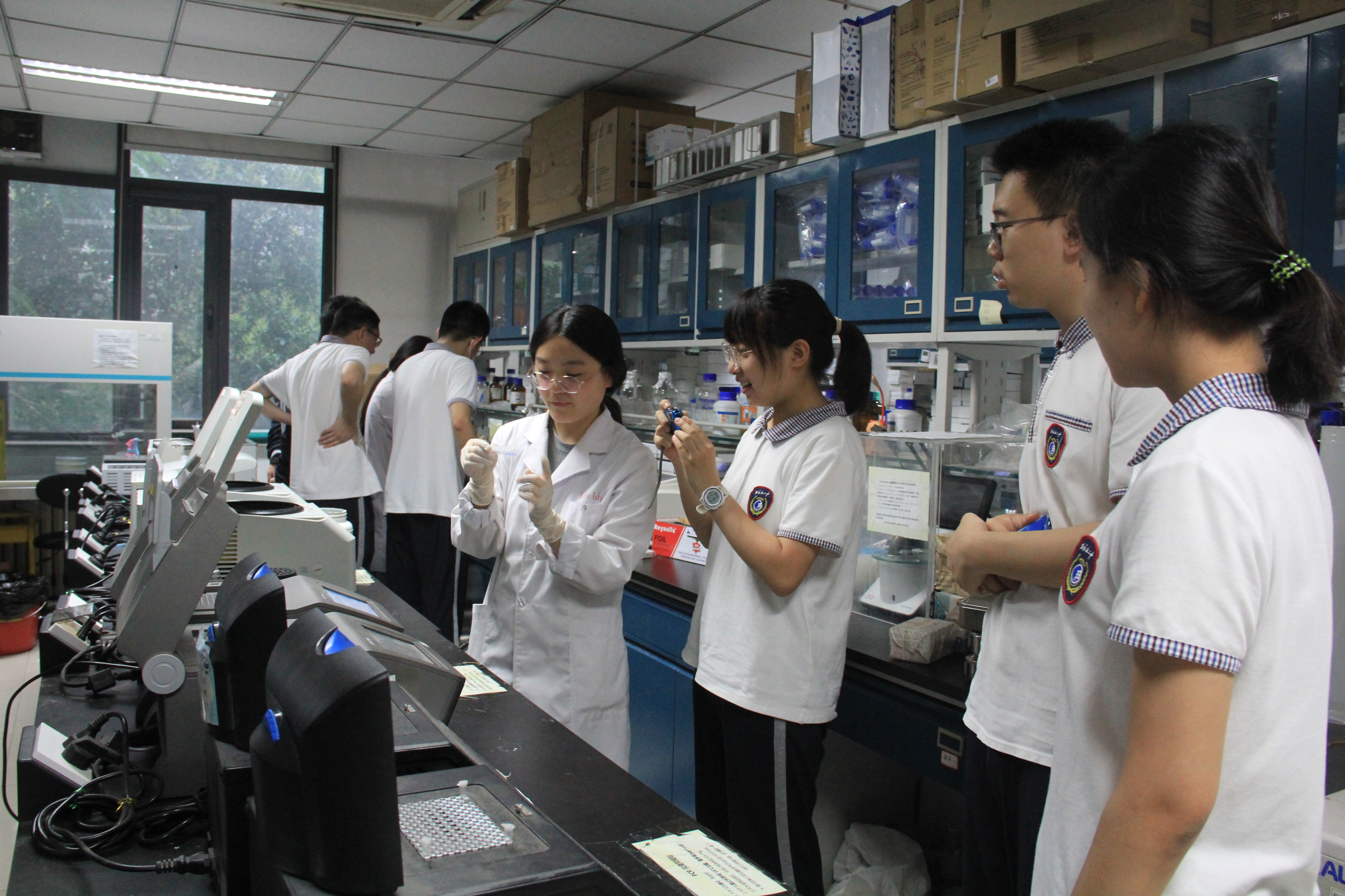 研学开始后,学生前往色中色 细胞学科实验室,观摩研究生展示的PCR扩增、DNA电泳等关键实验操作。随后在老师和研究生的指导下动手实践,学习仪器使用,并围绕仪器原理、科研应用、基因工程疑点、专业前景等进行互动问答,与老师和研究生展开深度交流。色中色 教师和研究生不仅详细讲解操作要点,还对相关生物学知识进行了深入浅出地阐释。